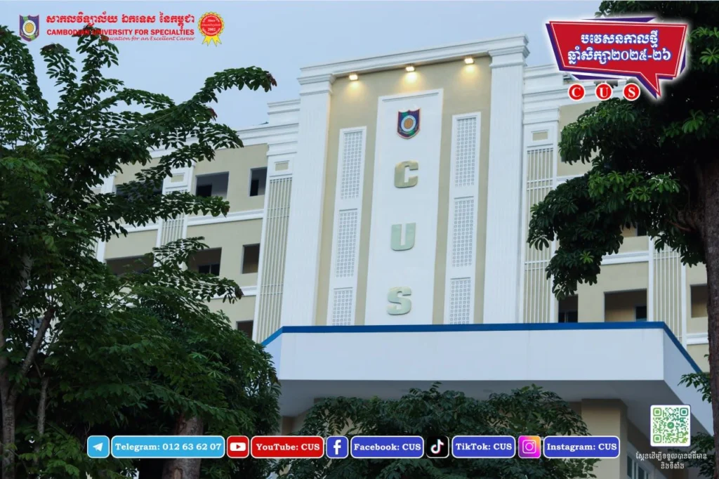 Cambodian University for Specialties (CUS) is a private university in Phnom Penh, Cambodia, offering a wide range of undergraduate and graduate programs designed to prepare students for professional careers. The university provides degrees in fields such as medicine, dentistry, law, business administration, economics, and information technology. Cambodian University for Specialties focuses on combining academic knowledge with practical training so that students develop both theoretical understanding and real-world skills. The institution supports a learning environment that encourages research, critical thinking, and professional development. With experienced faculty members and modern learning facilities, students are prepared for careers in healthcare, business, and other professional sectors. Cambodian University for Specialties continues to contribute to Cambodia’s higher education sector by developing qualified professionals ready to serve their communities.